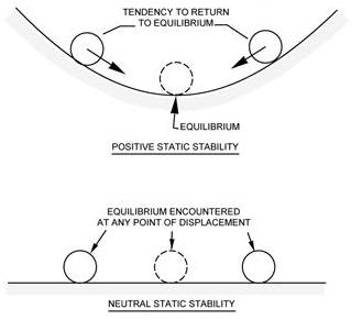 Positive stability can be illustrated by a ball inside of a bowl. If the ball is displaced from its normal resting place at the bottom of the bowl, it will eventually return to its original position at the bottom of the bowl. [Figure 1-19]