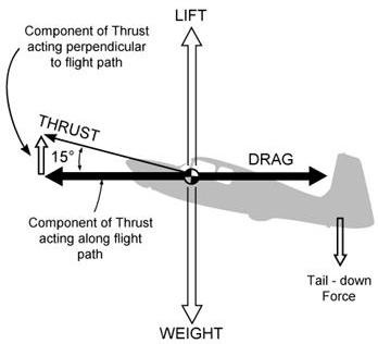 Note that now thrust has two components; one acting perpendicular to the flightpath in the direction of lift, while the other acts along the flightpath. Because the actual thrust is inclined, its magnitude must be greater than drag if its component of thrust along the flightpath is to equal drag. Also note that a component of thrust acts 90° to the flightpath, and thus acts in the same direction as wing lift. Figure 1-37 also illustrates that the forces acting upward (wing lift and the component of thrust) equal the forces acting downward (weight and tail-down force).