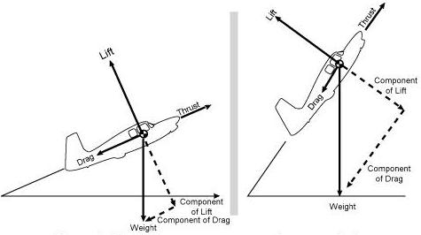 The forces acting on an airplane during a climb are illustrated in figure 1-37. When the airplane is in equilibrium, the weight can be resolved into two components: one opposing the lift, and the other acting in the same direction as the drag along the line of the relative wind. The requirements for equilibrium are: the thrust must equal the sum of the drag and the opposing component of the weight; and the lift must equal its opposing component of the weight. The steeper the angle of climb, the shorter becomes the length of the component of lift, and simultaneously the component of drag becomes longer. Therefore, the lift requirement decreases steadily as the angle of climb steppens until, in a true vertical climb, if this were possible, the wings would supply no lift and the thrust would be the only force opposing both the drag and the weight, which would be acting downward in opposition.