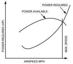 The vertical distance between the power-available and power-required curves represents the power available for climbing at the particular speed.