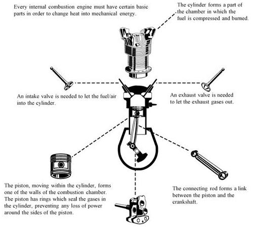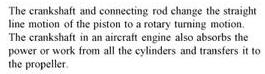 Most light airplane engines are internal combustion of the reciprocating type which operate on the same principle as automobile engines. They are called reciprocating engines because certain parts move back and forth in contrast to a circular motion such as a turbine. Some smaller airplanes are equipped with turbine engines, but this type will not be discussed in this handbook. As shown in figure 2-5, the reciprocating engine consists of cylinders, pistons, connecting rods, and a crankshaft. One end of a connecting rod is attached to a piston and the other end to the crankshaft.