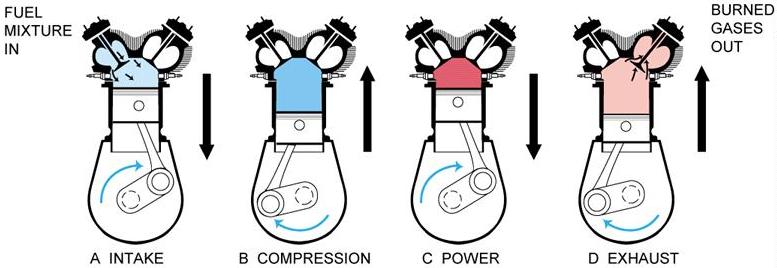 Diagram D shows that just before the piston completes the power stroke the exhaust valve starts to open, and the burned gases are forced out as the piston returns to the top of the cylinder. This is the exhaust stroke. The cycle is then ready to begin again as shown in Diagram A.