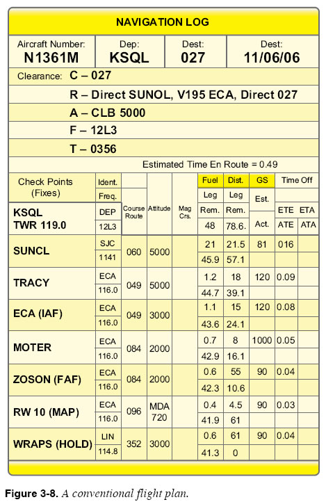 Suppose you have planned a flight from San Carlos Airport (KSQL) to Oakdale Airport (O27), as shown in the flight plan appearing in Figure 3-8. The planned route proceeds directly to SUNOL intersection, then follows V195 until reaching ECA, the initial approach fix for the GPS Runway 10 approach into Oakdale. The distances, bearings, estimated times en route, and fuel requirements for the flight have all been calculated. The next step is to enter some of these details into the FMS.
