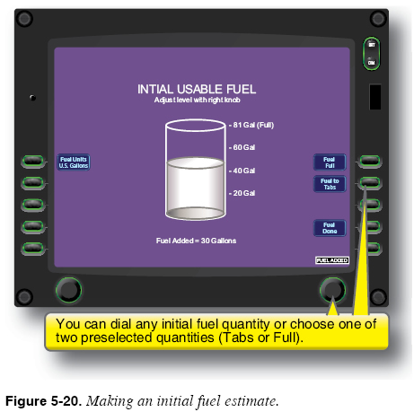 Initial Fuel Estimate Many fuel management functions lack a fuel quantity sensor. Without access to this raw data of fuel quantity, fuel management functions perform calculations using an initial fuel estimate that was provided by the pilot prior to departure. Figure 5-20 illustrates how an initial fuel estimate is given for one manufacturer’s fuel management unit.