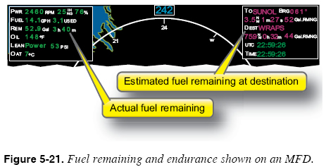 It is important to make accurate estimates of initial fuel because the fuel management function uses this estimate in making predictions about fuel levels at future times during the flight. For example, if you overestimate the initial fuel by eight gallons and plan to land with seven gallons of reserve fuel, you could observe normal fuel indications from the fuel management system, yet experience fuel exhaustion before the end of the flight. The accuracy of the fuel calculations made by the fuel management function is only as good as the accuracy of the initial fuel estimate. You must know the capacity of the aircraft fuel tanks and amount of fuel required to fill the tanks to any measured intermediate capacity (e.g., “tabs”). When full fuel capacity is entered into the fuel management system, the tanks must be filled to the filler caps. For some aircraft, even a fraction of an inch of space between the filler cap and the fuel can mean that the tanks have been filled only to several gallons under maximum capacity. Objects can plug lines, preventing the fuel from flowing to the pickup point. Some aircraft have bladders and dividers in the fuel system. A bladder can move within the tank area and not actually hold the quantity of fuel specified. Always check to ensure that the fuel servicing total matches the quantity needed to fill the tank(s) to the specified level. Estimating Amount of Fuel on Board Since the fuel management function’s predictions are often based on the initial quantity entered, it is important to monitor the fuel gauges to ensure agreement with the fuel management function of the FMS as the flight progresses. It is always prudent to use the most conservative of these measures when estimating fuel on board. Predicting Fuel at a Later Point in the Flight A primary function of the fuel management function or system is to allow you to predict fuel remaining at a future time in the flight. The fuel management system uses a combination of the currently available fuel and the current rate of fuel consumption to arrive at the measures. Some units require the current or estimated fuel burn rate to be entered. Some units have optional sensors for fuel flow and/ or quantity. Be absolutely sure of what equipment is installed in your specific aircraft and how to use it. Since the rate of fuel consumption instantly changes when power or mixture is adjusted, (usually with altitude) the fuel management function or system should continually update its predictions. It is common for the fuel management system to calculate fuel remaining at the arrival of the active waypoint, and the last waypoint in the route programmed into the FMS/RNAV. These measures are shown on the MFD in Figure 5-21.