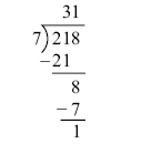 Example: 218 landing gear bolts need to be divided between 7 aircraft. How many bolts will each aircraft receive?