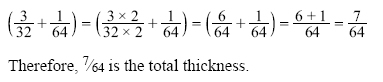 Example: Find the total thickness of a panel made from 3/32-inch thick aluminum, which has a paint coating that is 1/64-inch thick. To add these fractions, determine a common denominator. The least common denominator for this example is 1, so only the first fraction must be changed since the denominator of the second fraction is already 64.