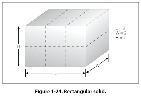 rectangle-shaped sides. [Figure 1-24] The volume is the number of cubic units within the rectangular solid. The formula for the volume of a rectangular solid is: