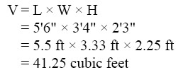 Example: A rectangular baggage compartment measures 5 feet 6 inches in length, 3 feet 4 inches in width, and 2 feet 3 inches in height. How many cubic feet of baggage will it hold? First, substitute the known values into the formula.