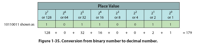 Converting Binary Numbers to Decimal Numbers To convert a binary number to a decimal number, add up the place values that have a 1 (place values that have a zero do not contribute to the decimal number conversion). Example: Convert the binary number 10110011 to a decimal number. Using the Place Value chart shown in Figure 1-35, add up the place values of the ‘1s’ in the binary number (ignore the place values with a zero in the binary number). The binary number 10110011