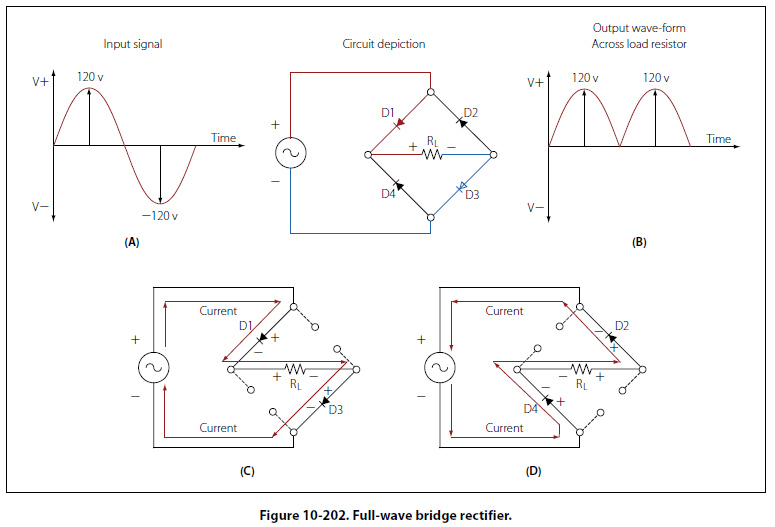 Full-Wave Rectifier Figure 10-202 illustrates a more common use of the diode as a rectifier. This type of a rectifier is called a full-wave bridge rectifier. The term “full-wave" indicates that the output is a continuous sequence of pulses rather than having gaps that appear in the halfwave rectifier.