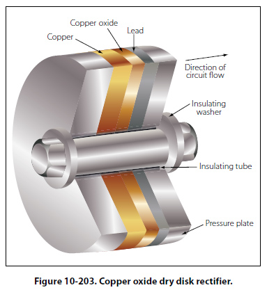Illustration C shows the initial condition, during which, a positive portion of the input signal is applied to the network. Note the polarities across the diodes. Diodes D2 and D4 are reverse biased and can be replaced with an open circuit. Diodes D1 and D3 are forward biased and act as an open circuit. The current path through the diodes is clear to see, and the resulting waveform is developed across the load resistor. During the negative portion of the applied signal, the diodes will reverse their polarity and bias states. The result is a network shown in illustration D. Current now passes through diodes D4 and D2, which are forward biased, while diodes D1 and D3 are essentially open circuits due to being reverse biased. Note that during both alternations of the input waveform, the current will pass through the load resistor in the same direction. This results in the negative swing of the waveform being flipped up to the positive side of the time line. Dry Disk Dry disk rectifiers operate on the principle that electric current flows through a junction of two dissimilar conducting materials more readily in one direction than it does in the opposite direction. This is true because the resistance to current flow in one direction is low, while in the other direction it is high. Depending on the materials used, several amperes may flow in the direction of low resistance but only a few milliamperes in the direction of high resistance. Three types of dry disk rectifiers may be found in aircraft: the copper oxide rectifier, the selenium rectifier, and the magnesium copper-sulfide rectifier. The copper oxide rectifier consists of a copper disk upon which a layer of copper oxide has been formed by heating. [Figure 10-203] It may also consist of a chemical copper oxide preparation spread evenly over the copper surface. Metal plates, usually lead plates, are pressed against the two opposite faces of the disk to form a good contact. Current flow is from the copper to the copper oxide.