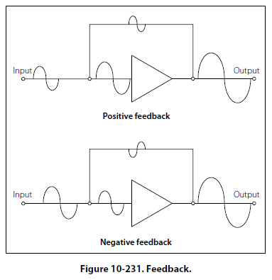 The main difference between these two signals is whether the feedback signal adds to the input signal or if the feedback signal diminishes the input signal. When the feedback is positive, the signal being returned to the input is in phase with the input signal and thus interferes constructively. Figure 10-231 illustrates this concept applied in the amplifier circuit through a block diagram. Notice that the feedback signal is in phase with the input signal, which will regenerate the input signal. This results in an output signal with amplitude greater than would have been without the constructive, positive feedback. This type of positive feedback is what causes an audio system to squeal.