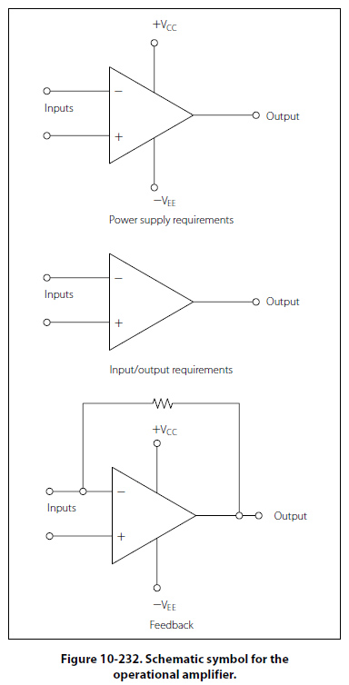 Figure 10-231 also illustrates with a block diagram how negative or degenerative feedback occurs. In this case, the feedback signal is out of phase with the input signal. This causes destructive interference and degenerates the input signal. The result is a lower amplitude output signal than would have occurred without the feedback. Operational Amplifiers An operational amplifier (OP AMP) is designed to be used with other circuit components and performs either computing functions or filtering. Operational amplifiers are usually high-gain amplifiers with the amount of gain governed by the amount of feedback. Operational amplifiers were originally developed for analog computers and used to perform mathematical functions. Today many devices use the operational amplifier for DC amplifiers, AC amplifiers, comparators, oscillators, and filter circuits. The widespread use is due to the fact that the OP AMP is a versatile device, small, and inexpensive. Built into the integrated chip, the operational amp is used as a basic building block of larger circuits. Figure 10-232 shows the schematic symbol for the operational amplifier. There are two inputs to the operational amplifier, inverting (-) and non-inverting (+), and there is one output. The polarity of a signal applied to the inverting input (-) will be reversed at the output. A signal applied to the non-inverting (+) input will retain its polarity on the output. To be classified as an operational amplifier, the circuit must have certain characteristics:
