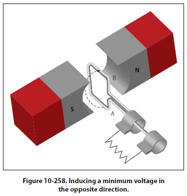 decreases because both sides of the loop (A and B) are approximately parallel to the lines of force and the rate of cutting is reduced. When the loop is vertical, no lines of force are cut since the wires are momentarily traveling parallel to the magnetic lines of force, and there is no induced voltage. As the rotation of the loop continues, the number of lines of force cut increases until the loop has rotated an additional 90° to a horizontal plane. As shown in Figure 10-257, the number of lines of force cut and the induced voltage once again are maximum.