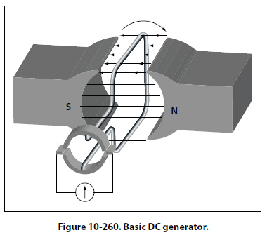 [Figure 10-260] In this illustration, the black side of the coil is connected to the black segment, and the white side of the coil to the white segment. The segments are insulated from each other. The two stationary brushes are placed on opposite sides of the commutator and are so mounted that each brush contacts each segment of the commutator as the latter revolves simultaneously with the loop. The rotating parts of a DC generator (coil and commutator) are called an armature. The generation of an emf by the loop rotating in the magnetic field is the same for both AC and DC generators, but the action of the commutator produces a DC voltage. |
