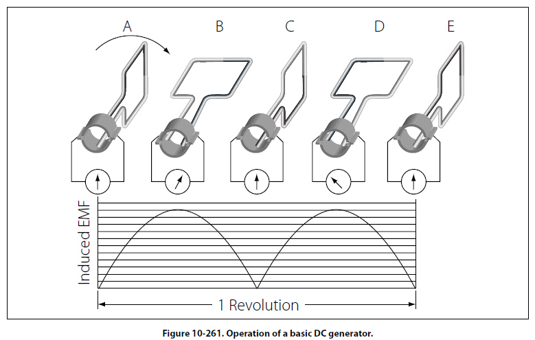 Generation of a DC Voltage Figure 10-261 illustrates in an elementary, step-by-step manner, how a DC voltage is generated. This is accomplished by showing a single wire loop rotating through a series of positions within a magnetic field.