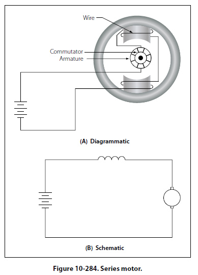 End Frame The end frame is the part of the motor opposite the commutator. Usually, the end frame is designed so that it can be connected to the unit to be driven. The bearing for the drive end is also located in the end frame. Sometimes the end frame is made a part of the unit driven by the motor. When this is done, the bearing on the drive end may be located in any one of a number of places. Types of DC Motors There are three basic types of DC motors: (1) series motors, (2) shunt motors, and (3) compound motors. They differ largely in the method in which their field and armature coils are connected. Series DC Motor In the series motor, the field windings, consisting of a relatively few turns of heavy wire, are connected in series with the armature winding. Both a diagrammatic and a schematic illustration of a series motor are shown in Figure 10-284. The same current flowing through the field winding also flows through the armature winding. Any increase in current, therefore, strengthens the magnetism of both the field and the armature.