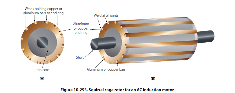The rotor of an induction motor consists of an iron core having longitudinal slots around its circumference in which heavy copper or aluminum bars are embedded. These bars are welded to a heavy ring of high conductivity on either end. The composite structure is sometimes called a squirrel cage, and motors containing such a rotor are called squirrel cage induction motors. [Figure 10-293]