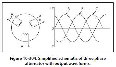 A simplified schematic diagram, showing each of three phases, is illustrated in Figure 10-304. The rotor is omitted for simplicity. The waveforms of voltage are shown to the right of the schematic. The three voltages are 120° apart and are similar to the voltages which would be generated by three single phase alternators whose voltages are out of phase by angles of 120°. The three phases are independent of each other.