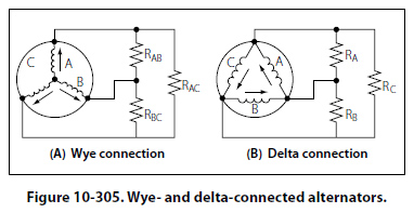 A three phase stator can also be connected so that the phases are connected end to end as shown in Figure 10-305B. This arrangement is called a delta connection. In a delta connection, the voltages are equal to the phase voltages; the line currents are equal to the vector sum of the phase currents; and the line current is equal to 1.73 times the phase current, when the loads are balanced. For equal loads (equal output), the delta connection supplies increased line current at a value of line voltage equal to phase voltage, and the wye connection supplies increased line voltage at a value of line current equal to phase current.