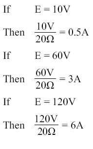 this relationship is true only if the resistance in the circuit remains constant. For it can be seen that if the resistance changes, current also changes. A graph of this relationship is shown in Figure 10-38, which uses a constant resistance of 20O. The relationship between voltage and current in this example shows voltage plotted horizontally along the X axis in values from 0 to 120 volts, and the corresponding values of current are plotted vertically in values from 0 to 6.0 amperes along the Y axis. A straight line drawn through all the points where the voltage and current lines meet represents the equation I = E/20 and is called a linear relationship.