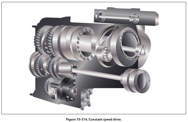 Alternator Constant Speed Drive System Alternators are not always connected directly to the airplane engine like DC generators. Since the various electrical devices operating on AC supplied by alternators are designed to operate at a certain voltage and at a specified frequency, the speed of the alternators must be constant; however, the speed of an airplane engine varies. Therefore, the engine, through a constant speed drive installed between the engine and the alternator, drives some alternators. A typical hydraulic-type drive is shown in Figure 10-314. The following discussion of a constant speed drive system will be based on such a drive, found on large multiengine aircraft.