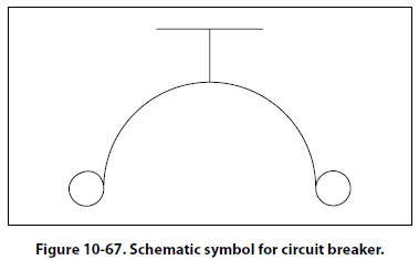 all the current in the circuit passes through it. In most fuses, the strip of metal is made of an alloy of tin and bismuth, which will melt and open the circuit when the current exceeds the rated capacity of the fuse. For example, if a 5-amp fuse is placed into a circuit, the fuse will allow currents up to 5 amps to pass. Because the fuse is intended to protect the circuit, it is quite important that its capacity match the needs of the circuit in which it is used. When replacing a fuse, consult the applicable manufacturer’s instructions to be sure a fuse of the correct type and capacity is installed. Fuses are installed in two types of fuse holders in aircraft. “Plug-in holders" or in-line holders are used for small and low capacity fuses. “Clip" type holders are used for heavy high capacity fuses and current limiters. Current Limiter The current limiter is very much like the fuse. However, the current limiter link is usually made of copper and will stand a considerable overload for a short period of time. Like the fuse it will open up in an over current condition in heavy current circuits such as 30 amp or greater. These are used primarily to sectionalize an aircraft circuit or bus. Once the limiter is opened, it must be replaced. The schematic symbol for the current limiter is the same as that for the fuse. Circuit Breaker The circuit breaker is commonly used in place of a fuse and is designed to break the circuit and stop the current flow when the current exceeds a predetermined value. Unlike the fuse, the circuit breaker can be reset; whereas the fuse or current limiter must be replaced. Figure 10-67 shows the schematic symbol for a circuit breaker.
