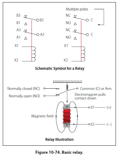 DIP Switches The acronym “DIP" switch is defined as Dual In-Line Parallel switch in reference to the physical layout. DIP switches are commonly found in card cages, and line replaceable units (LRU) are used in most cases to adjust gains, control configurations, and so forth. Each one of the switches is generally an SPST slide or rocker switch. The technician may find this switch in packages ranging in size from DIP2 through DIP32. Some of the more common sizes are DIP4 and DIP8. Switch Guards Switch guards are covers that protect a switch from unintended operation. Prior to the operation of the switch, the guard is usually lifted. Switch guards are commonly found on systems such as fire suppression and override logics for various systems. Relays A relay is simply an electromechanical switch where a small amount of current can control a large amount of current. Figure 10-74 illustrates the basic relay in