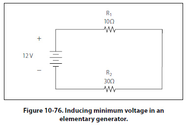 Figure 10-76 shows an additional resistor and a little more detail regarding the values. With these values, we can now begin to learn more about the nature of the circuit. In this configuration, there is a 12-volt DC source in series with two resistors, R1 = 10 O and R2 = 30 O. For resistors in a series configuration, the total resistance of the circuit is equal to the sum of the individual resistors. The basic formula is: