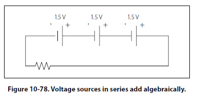 In Figure 10-78 all of the sources are in the same direction in terms of their polarity. All of the voltages have the same sign when added up. In the case of Figure 10-78, three cells of a value of 1.5 volts are in series