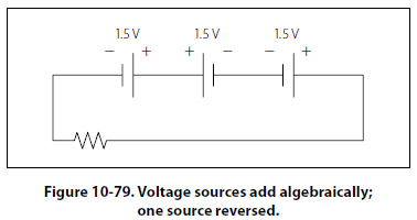 However, in Figure 10-79, one of the three sources has been turned around, and the polarity opposes the other two sources. Again the addition is simple:
