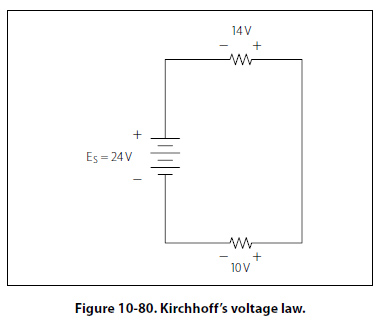 Figure 10-80 illustrates the very basic idea of Kirchhoff’s voltage law. There are two resistors in this example. One has a drop of 14 volts and the other has a drop of 10 volts. The source voltage must equal the sum of the voltage drops around the circuit. By inspection it is easy to determine the source voltage as 24 volts.