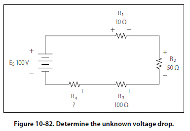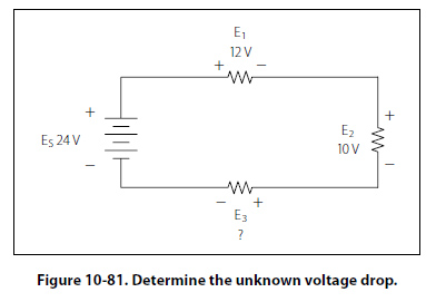 Figure 10-81 shows a series circuit with three voltage drops and one voltage source rated at 50 volts. Two of the voltage drops are known. However, the third is not known. Using Kirchhoff’s voltage law, the third voltage drop can be determined.