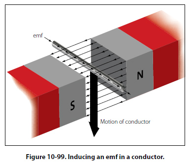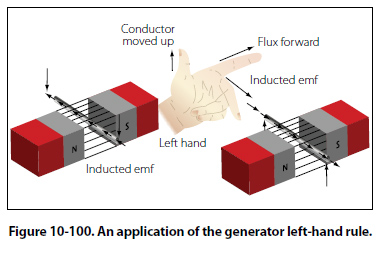 [Figure 10-99] The direction (polarity) of the induced emf is determined by the magnetic lines of force and the direction the conductor is moved through the magnetic field. The generator left-hand rule (not to be confused with the left-hand rules used with a coil) can be used to determine the direction of the induced emf. [Figure 10-100] The left-hand rule is summed up as follows: