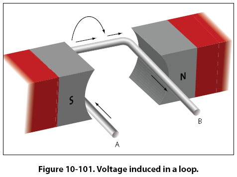 When a loop conductor is rotated in a magnetic field, a voltage is induced in each side of the loop. [Figure 10- 101] The two sides cut the magnetic field in opposite directions, and although the current flow is continuous, it moves in opposite directions with respect to the two sides of the loop. If sides A and B and the loop are rotated half a turn and the sides of the conductor have exchanged positions, the induced emf in each wire reverses its direction, since the wire formerly cutting the lines of force in an upward direction is now moving downward.