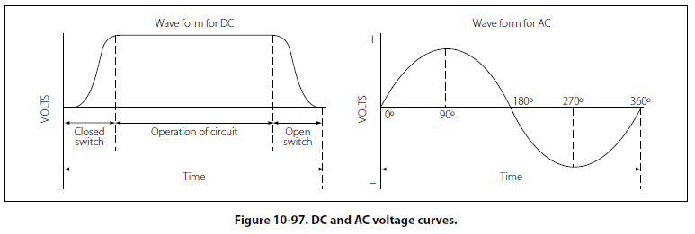 “AC" stands for Alternating Current. Many of the principles, characteristics, and effects of AC are similar to those of direct current. Similarly, there are a number of differences, which will be explained. Direct current flows constantly in only one direction with a constant polarity. It changes magnitude only when the circuit is opened or closed, as shown in the DC waveform in Figure 10-97. Alternating current changes direction at regular intervals, increases in value at a definite rate from zero to a maximum positive strength, and decreases back to zero; then it flows in the opposite direction, similarly increasing to a maximum negative value, and again decreasing to zero. DC and AC waveforms are compared in Figure 10-97.