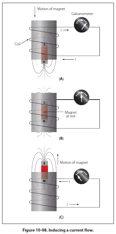 a conductor are wrapped around a cylindrical form, and the ends of the conductor are connected together to form a complete circuit, which includes a galvanometer. If a simple bar magnet is plunged into the cylinder, the galvanometer can be observed to deflect in one direction from its zero (center) position (Figure 10-98A).