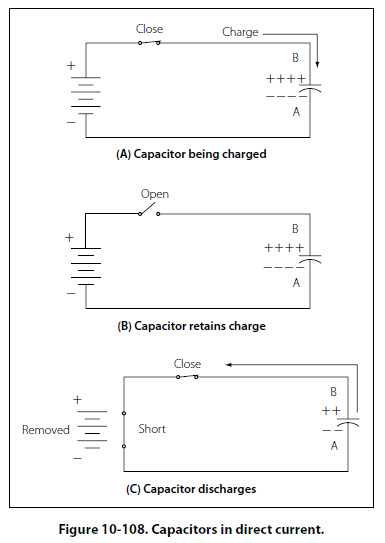 When a capacitor is connected across a source of direct current, such as a storage battery in the circuit shown in Figure 10-108A, and the switch is then closed, the plate marked B becomes positively charged, and the A plate negatively charged. Current flows in the external circuit during the time the electrons are moving from B to A. The current flow in the circuit is at a maximum