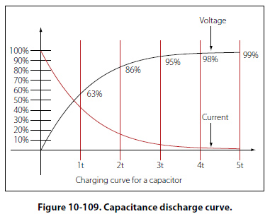 The time in the formula is that required to charge to 63% of the voltage of the source. The time required to bring the charge to about 99% of the source voltage is approximately 5 t. Figure 10-109 illustrates this relationship of a time constant characteristics of charging.