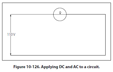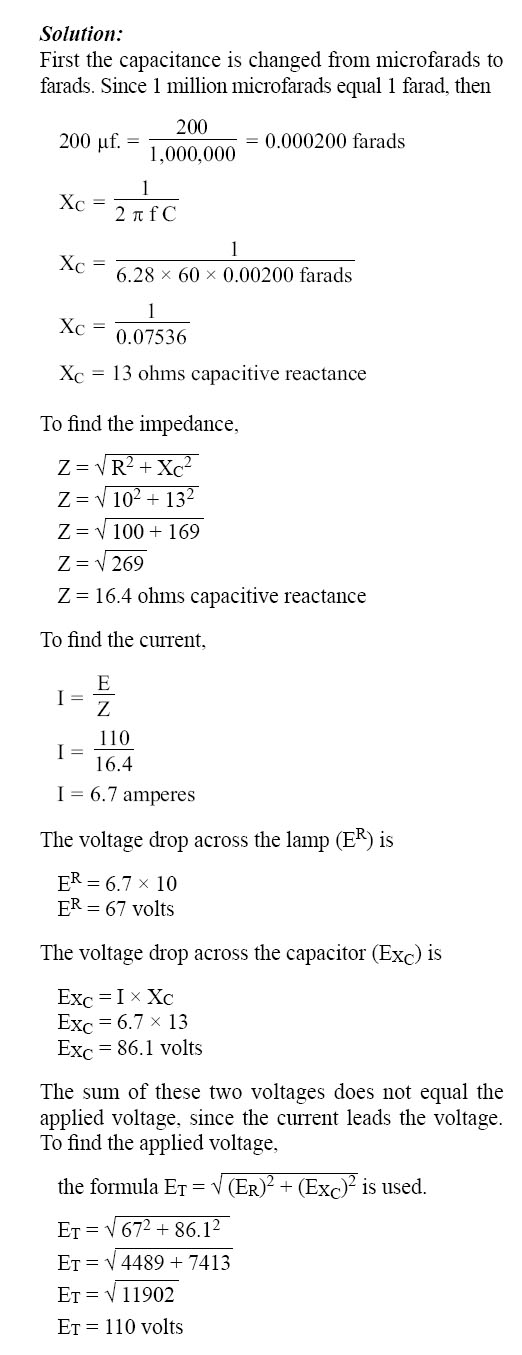 In Figure 10-129, a series circuit is illustrated in which a capacitor of 200 µf is connected in series with a 10 ohm lamp.