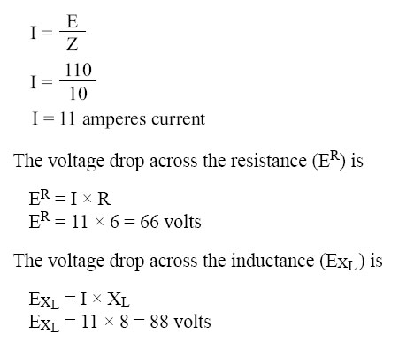 This formula can be used to determine the impedance when the values of inductive reactance and resistance are known. It can be modified to solve for impedance in circuits containing capacitive reactance and resistance by substituting XC in the formula in place of XL. In circuits containing resistance with both inductive and capacitive reactance, the reactances can be combined, but because their effects in the circuit are exactly opposite, they are combined by subtraction: X = XL - XC or X = XC - XL (the smaller number is always subtracted from the larger). In Figure 10-128, a series circuit consisting of resistance and inductance connected in series is connected to a source of 110 volts at 60 cycles per second. The resistive element is a lamp with 6 ohms resistance, and the inductive element is a coil with an inductance of 0.021 henry. What is the value of the impedance and the current through the lamp and the coil?