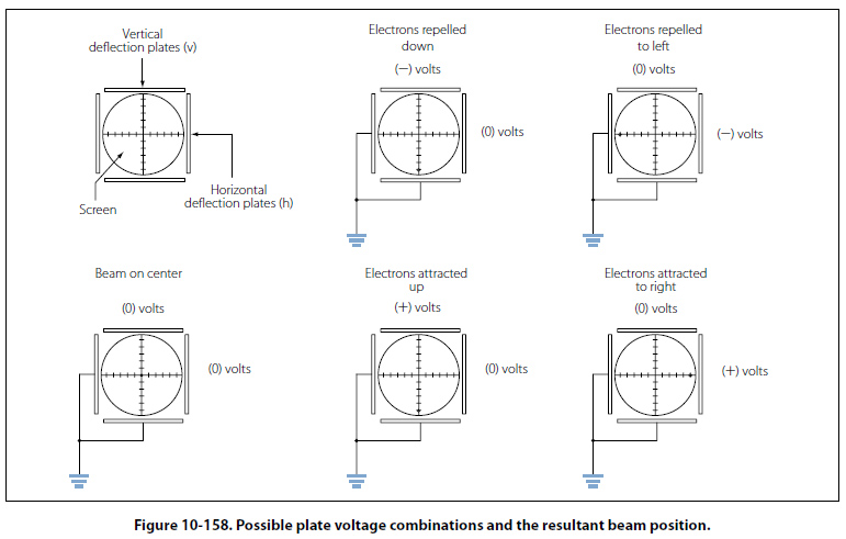 By providing a neutral or zero voltage to a deflection plate, the electron beam will be unaffected. By applying a negative voltage to a plate, the electron beam with be repelled and driven away from the plate. Finally, by applying a positive voltage, the electron beam will be drawing to the plate. Figure 10-158 provides a few possible plate voltage combinations and the resultant beam position.