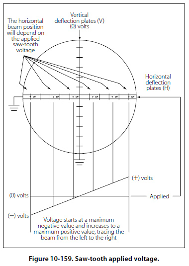 To get a visual representation of the input signal, an internally generated saw-tooth voltage is generated and then applied to the horizontal deflection plates. Figure 10-159 illustrates that the saw-tooth is a pattern of voltage applied, which begins at a negative voltage and increases at a constant rate to a positive voltage.