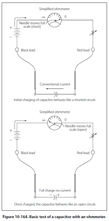 Figure 10-164 illustrates a basic test of a capacitor with an ohmmeter. There are usually two common modes of fail for a capacitor. One is a complete failure characterized by short circuit through the capacitor due to the dielectric breaking down or an open circuit. The more insidious failure occurs due to degradation, which is a gradual deterioration of the capacitor’s characteristics.