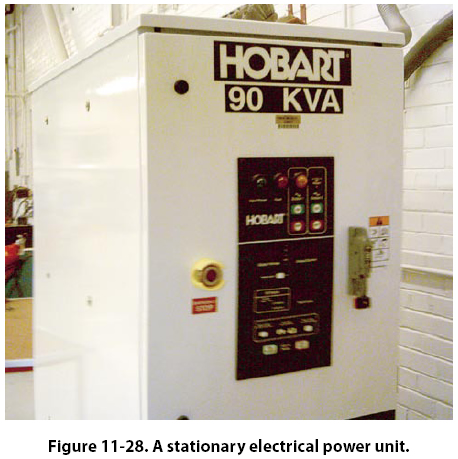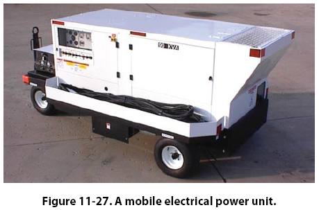 Self-propelled power units are normally more expensive than the towed units and in most instances supply a wider range of output voltages and frequencies. Another example, the stationary power unit shown in Figure 11-28 is capable of supplying DC power in varying amounts, as well as 115/200-volt, 3-phase, 400-cycle AC power continuously for 5 minutes.