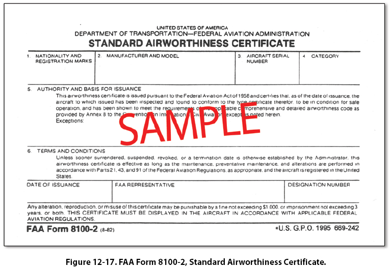 Chapter 12. Publications, Forms, & Records Structural Repair Manual (SRM) As the name implies, this manual carries detail information for the technician concerning an aircraft’s primary and secondary structure, criteria for evaluating the severity of the detected damage, determining the feasibility of a repair, and alignment/inspection information. This manual is usually a separate manual for large aircraft. On small aircraft, this information is often included in the AMM. Forms Airworthiness Certificates In addition to the registration certificate, which indicates the ownership of an aircraft, an airworthiness certificate indicates the airworthiness of the aircraft. Advisory Circular (AC) 21-12, Application for U.S. Airworthiness Certificate, FAA Form 8130-6, is a comprehensive guide for the completion of the application form for this certificate. There are two certificates: standard and special. FAA Form 8100-2, Standard Airworthiness Certificate, may be issued to allow operation of a type-certificated aircraft in one or more of the following categories: [Figure 12-17]
