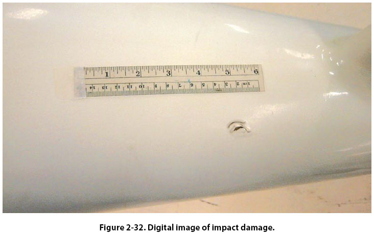 taken with a simple digital camera. To provide information about the extent of the damage, a measurement scale, or other object, such as a coin, can be placed near the area of concern before the picture is taken. Also, within the text of the e-mail, the technician should state the exact location of the damage, referenced to fuselage station, wing station, and so forth. |