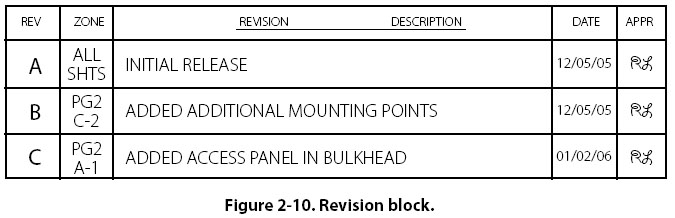 On assembly drawings, each item is identified by a number in a circle or square. An arrow connecting the number with the item assists in locating it in the bill of material. Other Drawing Data Revision Block Revisions to a drawing are necessitated by changes in dimensions, design, or materials. The changes are usually listed in ruled columns either adjacent to the title block or at one corner of the drawing. All changes to approved drawings must be carefully noted on all existing prints of the drawing. When drawings contain such corrections, attention is directed to the changes by lettering or numbering them and listing those changes against the symbol in a revision block. [Figure 2-10] The revision block contains