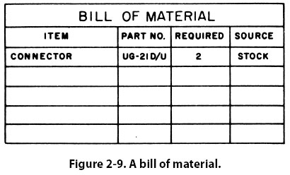 Bill of Material A list of the materials and parts necessary for the fabrication or assembly of a component or system is often included on the drawing. The list is usually in ruled columns in which are listed the part number, name of the part, material from which the part is to be constructed, the quantity required, and the source of the part or material. A typical bill of material is shown in Figure 2-9. On drawings that do not have a bill of material, the data may be indicated directly on the drawing.